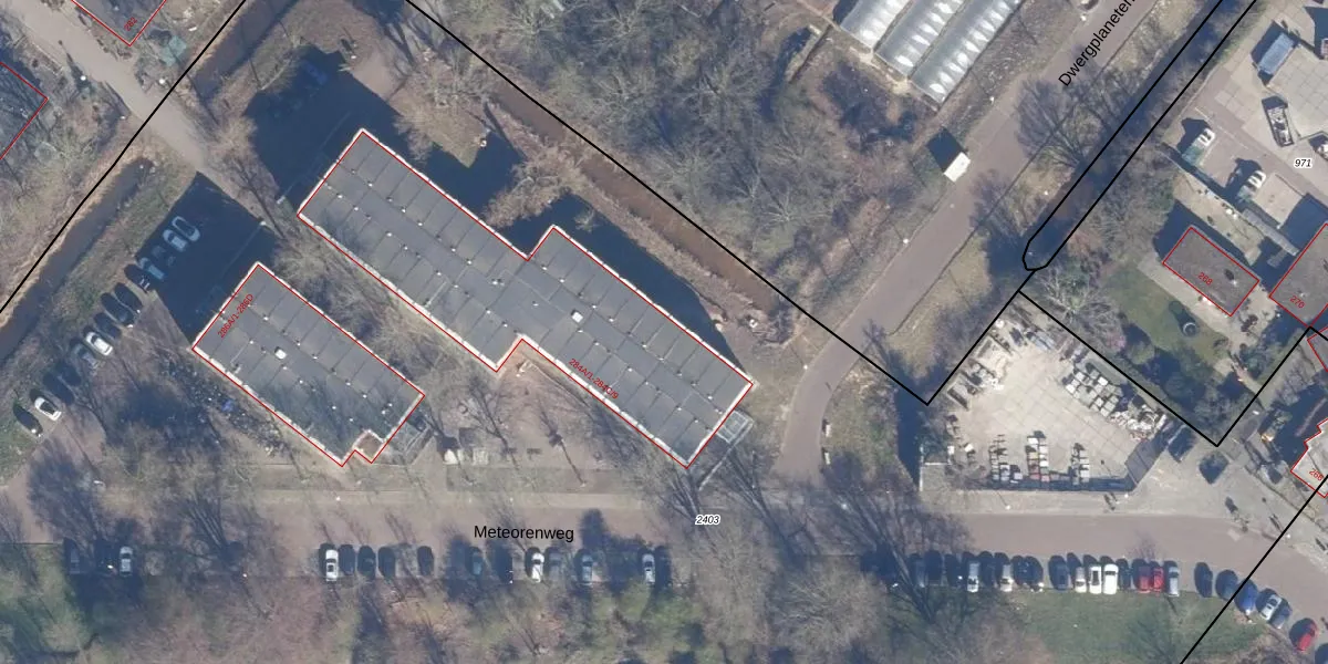 Het perceel waarop Meteorenweg 284-B-10 staat heeft een oppervlakte van 3,5 ha. Dit is een zeer groot perceel. De perceeloppervlakte wordt geregistreerd door het Kadaster. Gedetailleerde informatie over de maten van dit perceel kunt u vinden in het rapport Kadastrale kaart met maatvoering van Meteorenweg 284-B-10.
