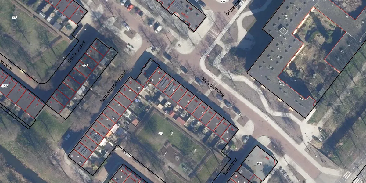 Het perceel waarop Meteorenweg 301 staat heeft een oppervlakte van 3598 m². Dit is een zeer groot perceel. De perceeloppervlakte wordt geregistreerd door het Kadaster. Gedetailleerde informatie over de maten van dit perceel kunt u vinden in het rapport Kadastrale kaart met maatvoering van Meteorenweg 301.