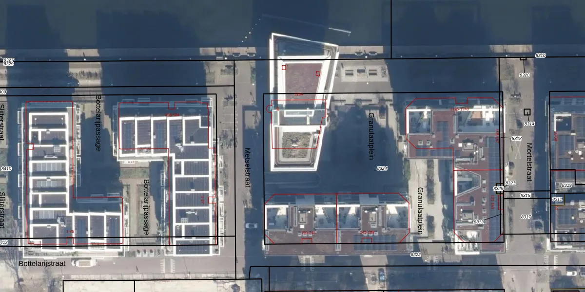 Het perceel waarop het adres ligt is ASD02-A-8324. De afkorting 'ASD02' staat voor kadastrale gemeente Amsterdam. De oppervlakte van het perceel is 4139 m². Dat is groter dan gemiddeld in Amsterdam, waar de gemiddelde perceeloppervlakte op 2763,93 m² ligt. De grootste perceeloppervlakte in de kadastrale gemeente is 14,3 ha. De kleinste oppervlakte bedraagt 0 m². Op het perceel liggen in totaal 94 adressen. De huidige grenzen van het perceel zijn digitaal in de Basisregistratie Kadaster (BRK) geregistreerd op 23-09-2019.