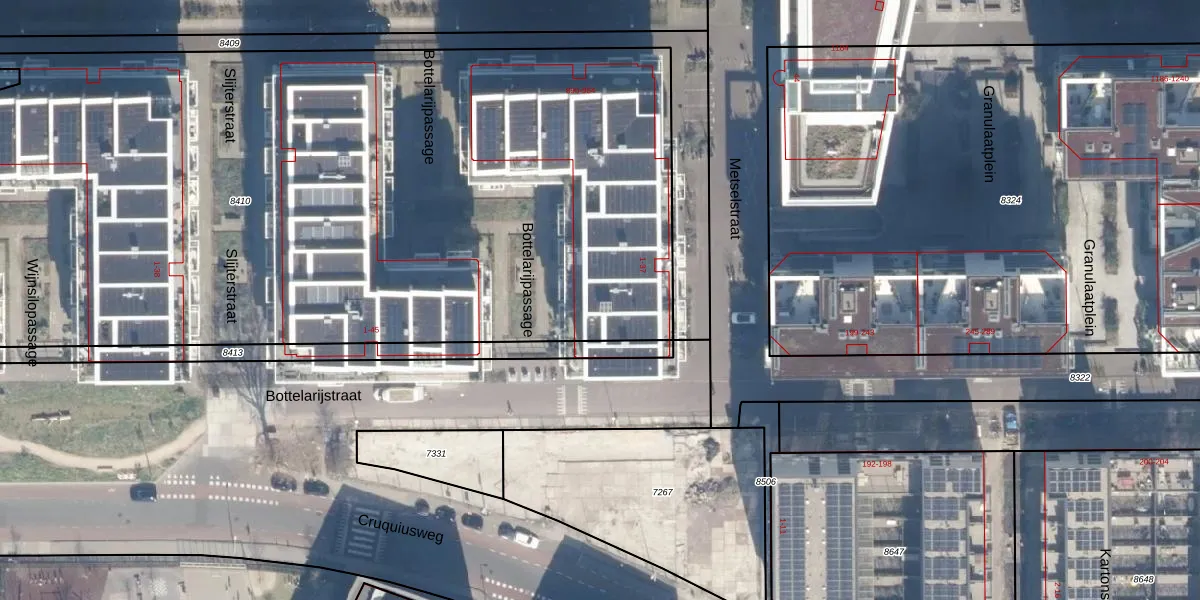 Het adres is gelegen op perceel 8410 in de sectie A en de kadastrale gemeente Amsterdam. De kadastrale aanduiding is aldus ASD02-A-8410. De gemiddelde perceeloppervlakte in de kadastrale gemeente Amsterdam is 2763,93 m². Dit perceel is met zijn 6995 m² dus groter dan gemiddeld. Het grootste perceel in de kadastrale gemeente is 14,3 ha. Het kleinste perceel heeft een oppervlakte van 0 m². Op het perceel zijn 167 adressen aanwezig. De huidige grenzen van het perceel zijn digitaal in de Basisregistratie Kadaster (BRK) geregistreerd op 30-08-2022.