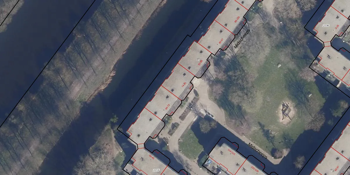 Midscheeps 75 is gelegen op kadastraal perceel ASD36AQ2215. Deze kadastrale aanduiding is uniek en wordt gebruikt door het Kadaster om eigendomsrechten en andere zakelijke rechten vast te leggen. Het perceel maakt onderdeel uit van de kadastrale gemeente Amsterdam.