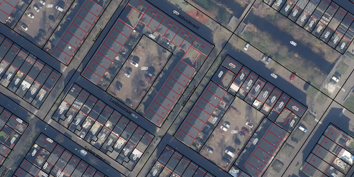 Het perceel waarop Mikonospad 10 staat heeft een oppervlakte van 2258 m². Dit is een zeer groot perceel. De perceeloppervlakte wordt geregistreerd door het Kadaster. Gedetailleerde informatie over de maten van dit perceel kunt u vinden in het rapport Kadastrale kaart met maatvoering van Mikonospad 10.