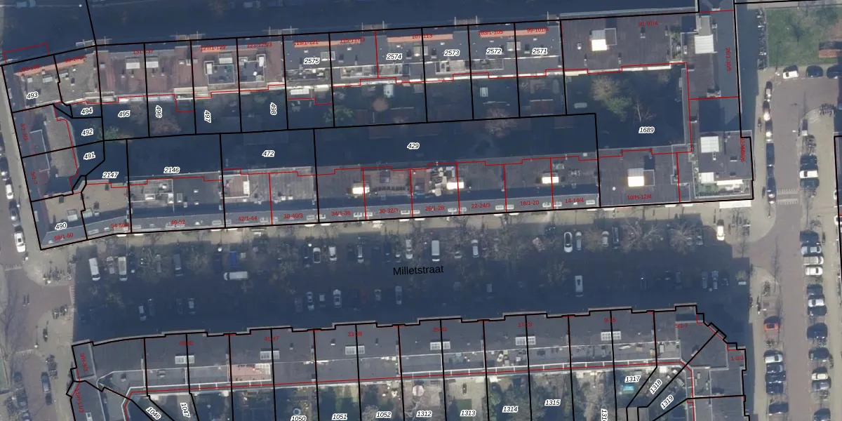 Milletstraat 28 is gelegen op kadastraal perceel ASD23AB429. Deze kadastrale aanduiding is uniek en wordt gebruikt door het Kadaster om eigendomsrechten en andere zakelijke rechten vast te leggen. Het perceel maakt onderdeel uit van de kadastrale gemeente Amsterdam.