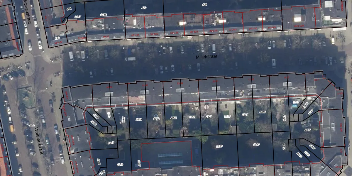 Het perceel waarop Milletstraat 37-2 staat heeft een oppervlakte van 323 m². Dit is een groot perceel. De perceeloppervlakte wordt geregistreerd door het Kadaster. Gedetailleerde informatie over de maten van dit perceel kunt u vinden in het rapport Kadastrale kaart met maatvoering van Milletstraat 37-2.