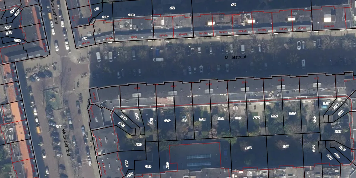 Het perceel waarop Milletstraat 43-1 staat heeft een oppervlakte van 323 m². Dit is een groot perceel. De perceeloppervlakte wordt geregistreerd door het Kadaster. Gedetailleerde informatie over de maten van dit perceel kunt u vinden in het rapport Kadastrale kaart met maatvoering van Milletstraat 43-1.