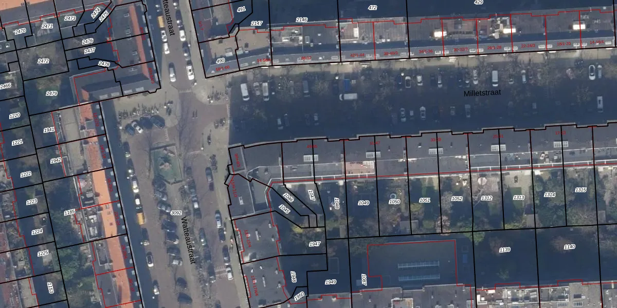 Milletstraat 53-2 is gelegen op kadastraal perceel ASD23AB1047. Deze kadastrale aanduiding is uniek en wordt gebruikt door het Kadaster om eigendomsrechten en andere zakelijke rechten vast te leggen. Het perceel maakt onderdeel uit van de kadastrale gemeente Amsterdam.