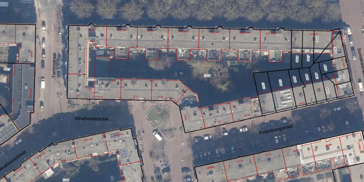 Het perceel waarop Minahassastraat 33 staat heeft een oppervlakte van 5180 m². Dit is een zeer groot perceel. De perceeloppervlakte wordt geregistreerd door het Kadaster. Gedetailleerde informatie over de maten van dit perceel kunt u vinden in het rapport Kadastrale kaart met maatvoering van Minahassastraat 33.