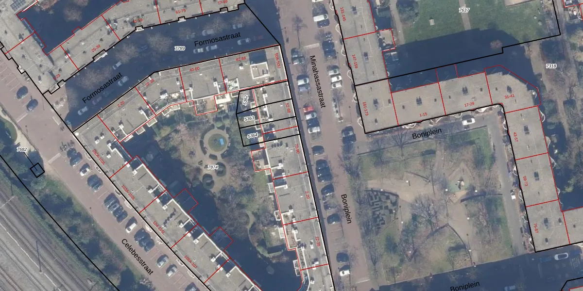 Minahassastraat 82 is gelegen op kadastraal perceel ASD19W7874. Deze kadastrale aanduiding is uniek en wordt gebruikt door het Kadaster om eigendomsrechten en andere zakelijke rechten vast te leggen. Het perceel maakt onderdeel uit van de kadastrale gemeente Amsterdam.
