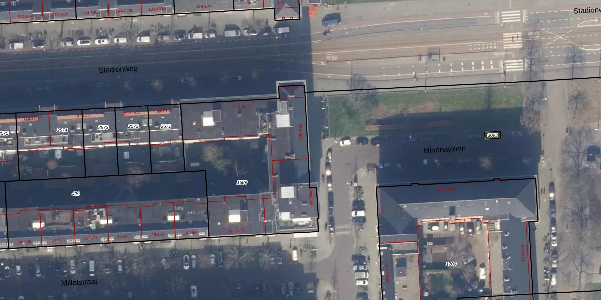 Het perceel waarop Minervaplein 30-1 staat heeft een oppervlakte van 1769 m². Dit is een zeer groot perceel. De perceeloppervlakte wordt geregistreerd door het Kadaster. Gedetailleerde informatie over de maten van dit perceel kunt u vinden in het rapport Kadastrale kaart met maatvoering van Minervaplein 30-1.