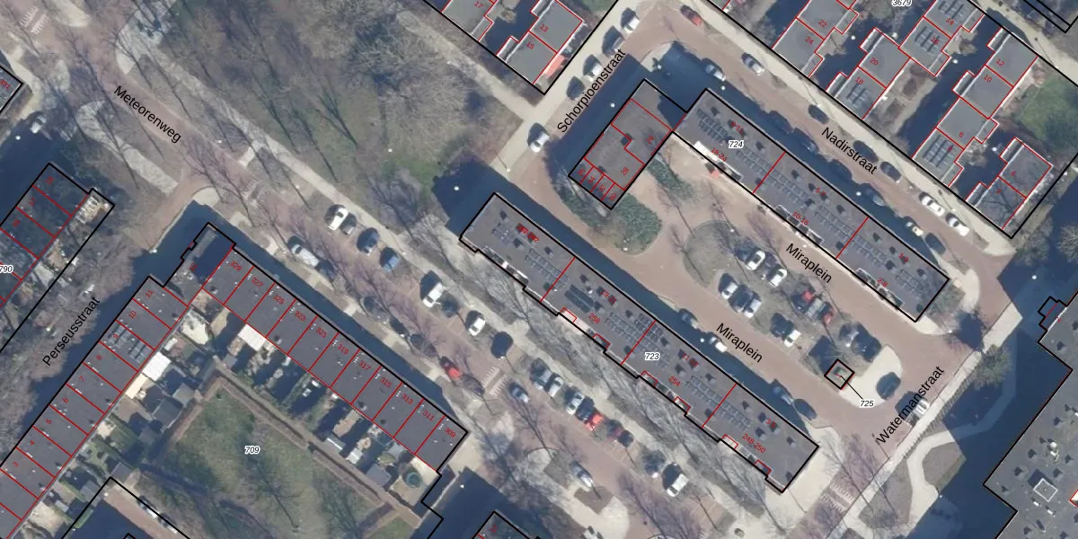 Het perceel waarop Miraplein 25 staat heeft een oppervlakte van 793 m². Dit is een groot perceel. De perceeloppervlakte wordt geregistreerd door het Kadaster. Gedetailleerde informatie over de maten van dit perceel kunt u vinden in het rapport Kadastrale kaart met maatvoering van Miraplein 25.