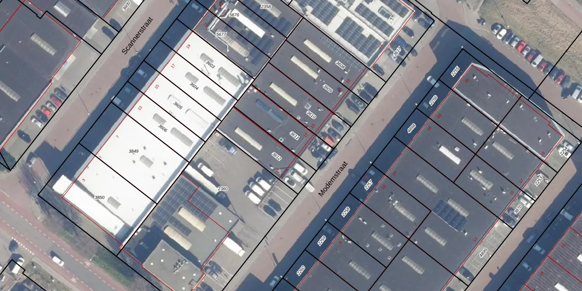 Het perceel waarop Modemstraat 13 staat heeft een oppervlakte van 355 m². Dit is een groot perceel. De perceeloppervlakte wordt geregistreerd door het Kadaster. Gedetailleerde informatie over de maten van dit perceel kunt u vinden in het rapport Kadastrale kaart met maatvoering van Modemstraat 13.