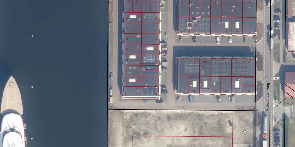 Het perceel waarop Moezelhavenweg 79 staat heeft een oppervlakte van 8850 m². Dit is een zeer groot perceel. De perceeloppervlakte wordt geregistreerd door het Kadaster. Gedetailleerde informatie over de maten van dit perceel kunt u vinden in het rapport Kadastrale kaart met maatvoering van Moezelhavenweg 79.