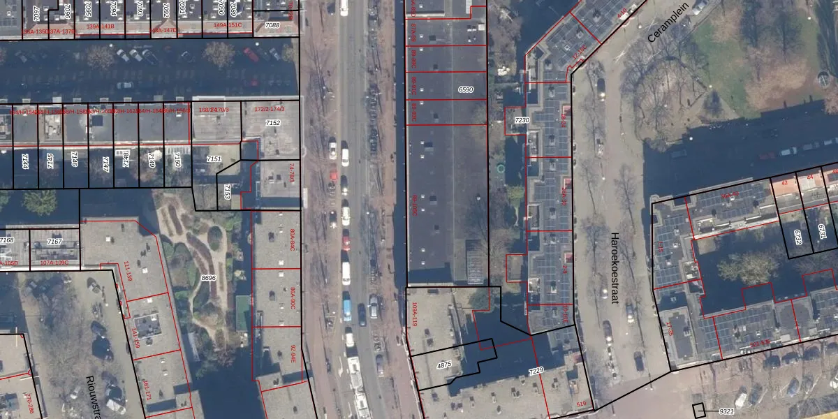 Het perceel waarop het adres ligt is ASD19-W-6590. De afkorting 'ASD19' staat voor kadastrale gemeente Amsterdam. De gemiddelde perceelgrootte in Amsterdam is 1563,05 m². Dit perceel is kleiner: de perceeloppervlakte bedraagt 1400 m². Het grootste perceel in de kadastrale gemeente is 17,9 ha. Het kleinste perceel heeft een oppervlakte van 0 m². Op het perceel zijn 36 adressen aanwezig. De laatste wijziging in het de Basisregistratie Kadaster (BRK) was op 05-02-2007.