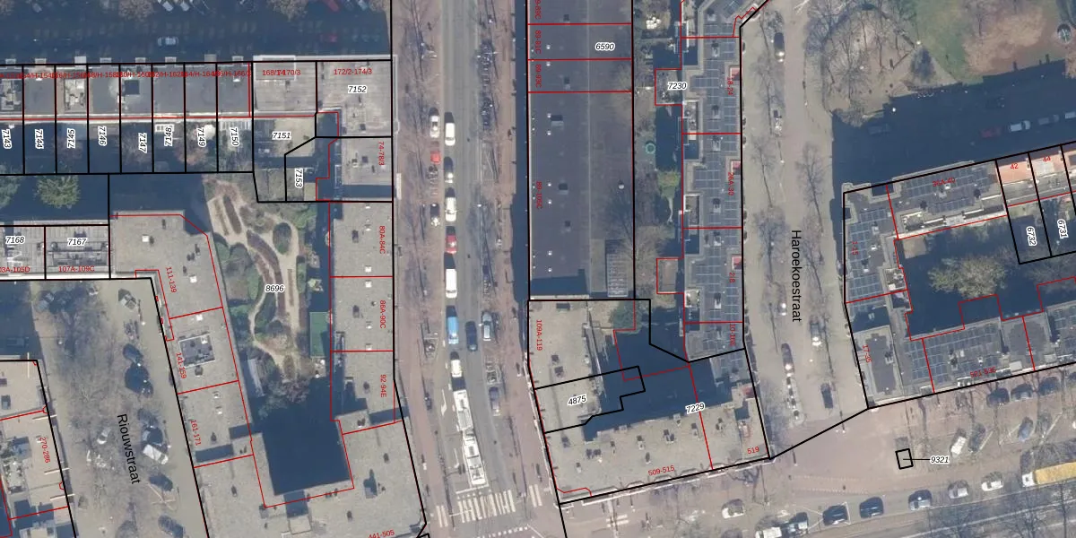 Het perceel waarop het adres ligt is ASD19-W-6590. De afkorting 'ASD19' staat voor kadastrale gemeente Amsterdam. De gemiddelde perceelgrootte in Amsterdam is 1563,05 m². Dit perceel is kleiner: de perceeloppervlakte bedraagt 1400 m². Het grootste perceel in de kadastrale gemeente is 17,9 ha. Het kleinste perceel heeft een oppervlakte van 0 m². Op het perceel zijn 36 adressen aanwezig. De laatste wijziging in het de Basisregistratie Kadaster (BRK) was op 05-02-2007.