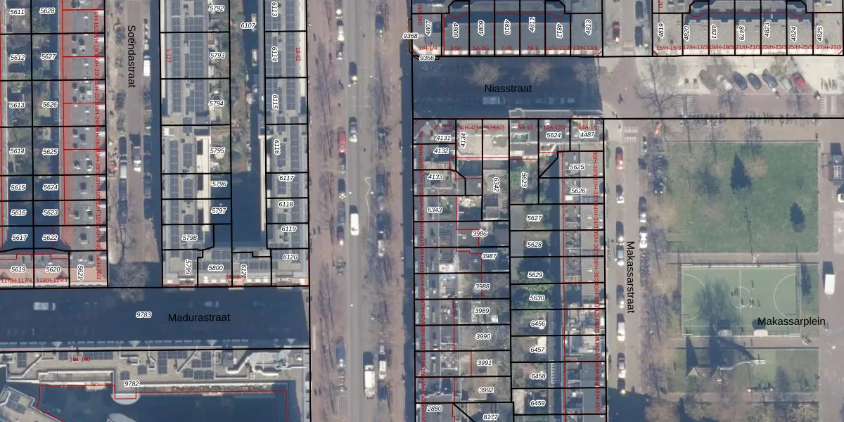 Het perceel waarop Molukkenstraat 39-1 staat heeft een oppervlakte van 99 m². Dit is een klein perceel. De perceeloppervlakte wordt geregistreerd door het Kadaster. Gedetailleerde informatie over de maten van dit perceel kunt u vinden in het rapport Kadastrale kaart met maatvoering van Molukkenstraat 39-1.