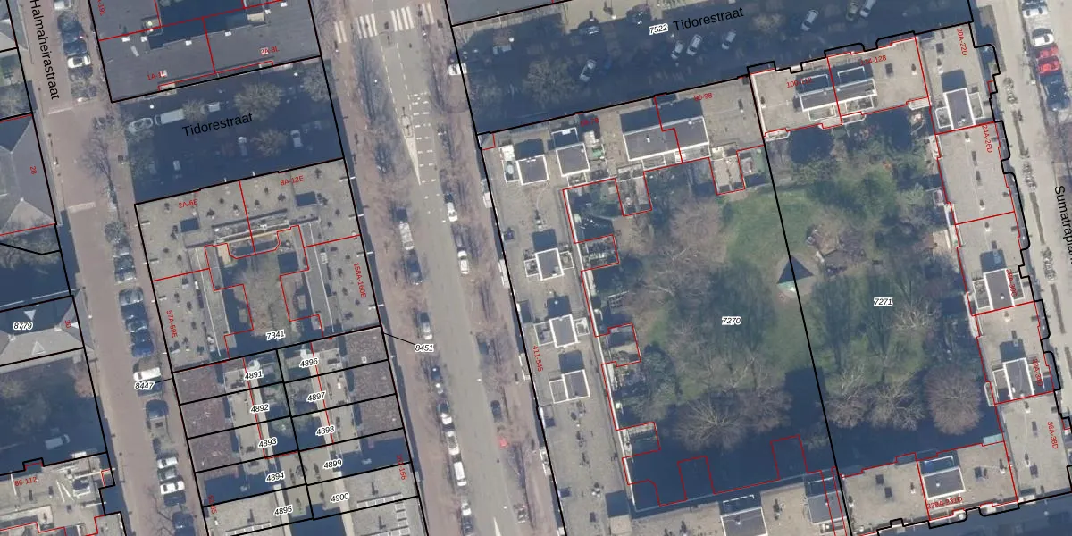 Het perceel waarop Molukkenstraat 445 staat heeft een oppervlakte van 4571 m². Dit is een zeer groot perceel. De perceeloppervlakte wordt geregistreerd door het Kadaster. Gedetailleerde informatie over de maten van dit perceel kunt u vinden in het rapport Kadastrale kaart met maatvoering van Molukkenstraat 445.