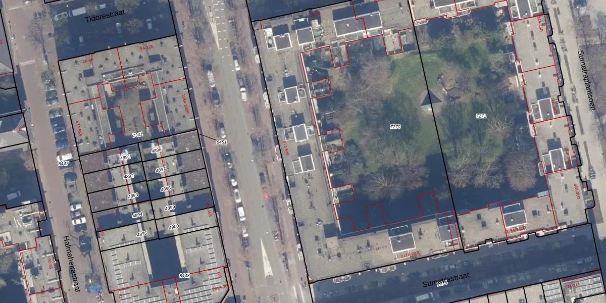 Het adres is gelegen op perceel 7270 in de sectie W en de kadastrale gemeente Amsterdam. De kadastrale aanduiding is aldus ASD19-W-7270. De oppervlakte van het perceel is 4571 m². Dat is groter dan gemiddeld in Amsterdam, waar de gemiddelde perceeloppervlakte op 1563,05 m² ligt. Het grootste perceel in de kadastrale gemeente is 17,9 ha. Het kleinste perceel heeft een oppervlakte van 0 m². Er zijn 108 adressen aanwezig op het perceel. De huidige grenzen van het perceel zijn digitaal in de Basisregistratie Kadaster (BRK) geregistreerd op 05-02-2007.