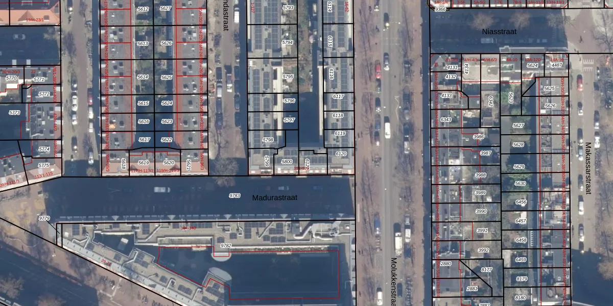Het perceel waarop Molukkenstraat 48-E staat heeft een oppervlakte van 66 m². Dit is een klein perceel. De perceeloppervlakte wordt geregistreerd door het Kadaster. Gedetailleerde informatie over de maten van dit perceel kunt u vinden in het rapport Kadastrale kaart met maatvoering van Molukkenstraat 48-E.