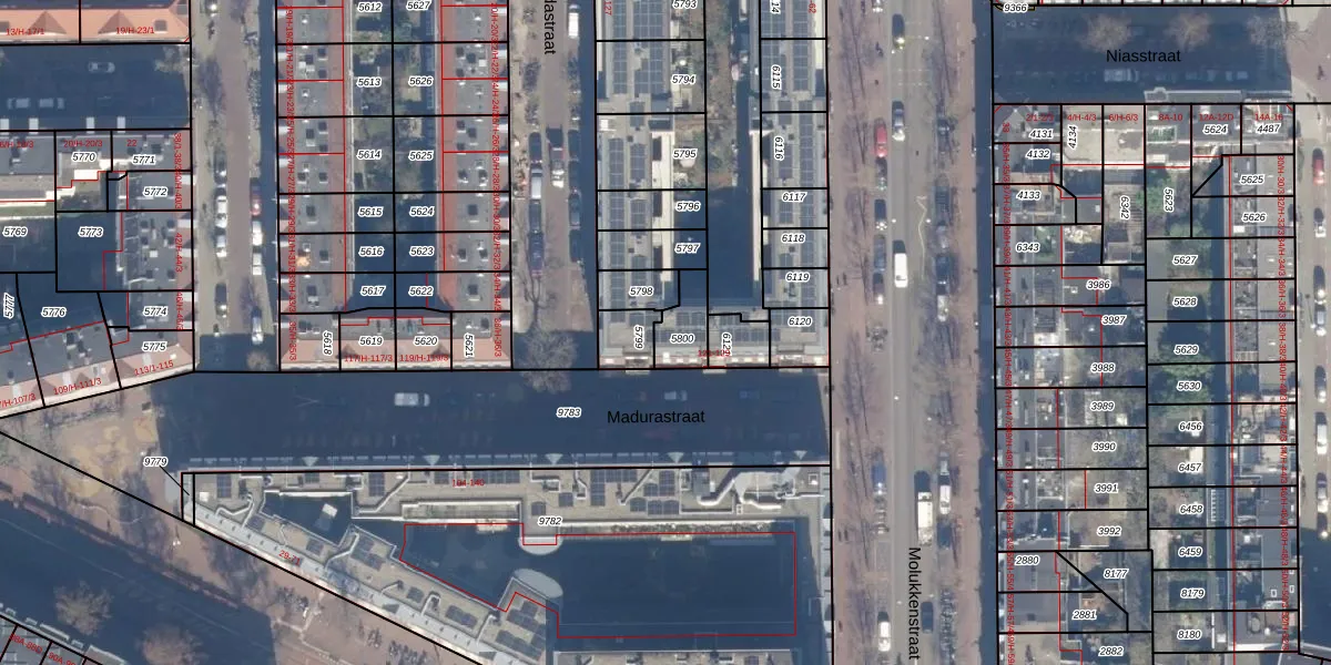 Het perceel waarop Molukkenstraat 48-P staat heeft een oppervlakte van 96 m². Dit is een klein perceel. De perceeloppervlakte wordt geregistreerd door het Kadaster. Gedetailleerde informatie over de maten van dit perceel kunt u vinden in het rapport Kadastrale kaart met maatvoering van Molukkenstraat 48-P.