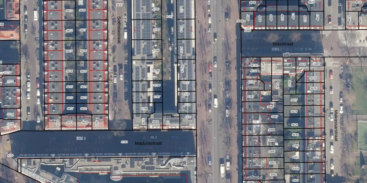 Het perceel waarop Molukkenstraat 48-T staat heeft een oppervlakte van 60 m². Dit is een klein perceel. De perceeloppervlakte wordt geregistreerd door het Kadaster. Gedetailleerde informatie over de maten van dit perceel kunt u vinden in het rapport Kadastrale kaart met maatvoering van Molukkenstraat 48-T.