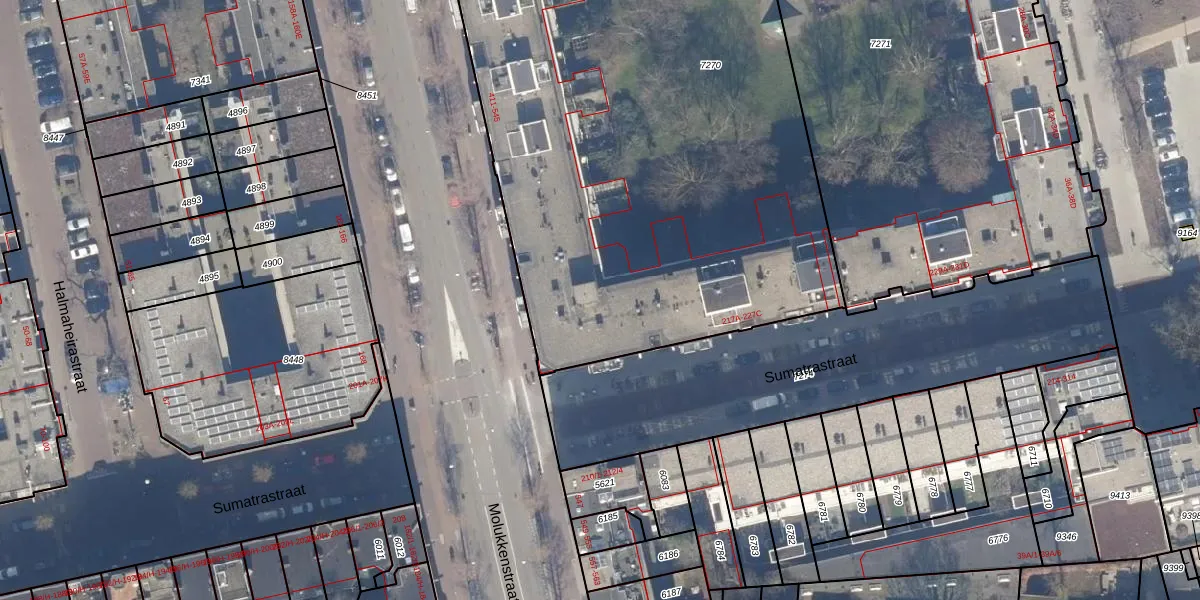 Het perceel waarop Molukkenstraat 499 staat heeft een oppervlakte van 4571 m². Dit is een zeer groot perceel. De perceeloppervlakte wordt geregistreerd door het Kadaster. Gedetailleerde informatie over de maten van dit perceel kunt u vinden in het rapport Kadastrale kaart met maatvoering van Molukkenstraat 499.