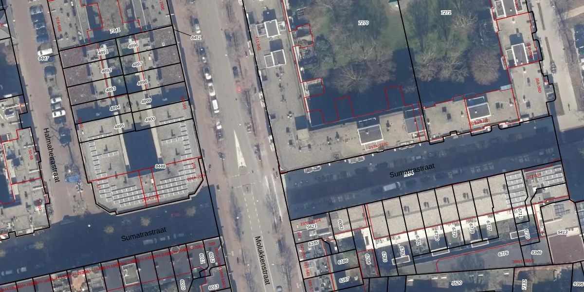 Het perceel waarop Molukkenstraat 539 staat heeft een oppervlakte van 4571 m². Dit is een zeer groot perceel. De perceeloppervlakte wordt geregistreerd door het Kadaster. Gedetailleerde informatie over de maten van dit perceel kunt u vinden in het rapport Kadastrale kaart met maatvoering van Molukkenstraat 539.