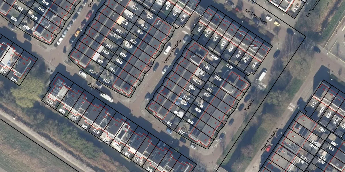 Het perceel waarop Monte Perdido 11 staat heeft een oppervlakte van 108 m². Dit is een middelgroot perceel. De perceeloppervlakte wordt geregistreerd door het Kadaster. Gedetailleerde informatie over de maten van dit perceel kunt u vinden in het rapport Kadastrale kaart met maatvoering van Monte Perdido 11.