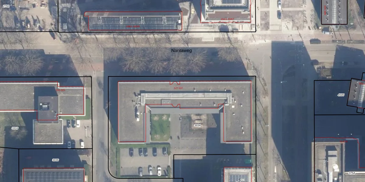 Het perceel waarop Naritaweg 135 staat heeft een oppervlakte van 3942 m². Dit is een zeer groot perceel. De perceeloppervlakte wordt geregistreerd door het Kadaster. Gedetailleerde informatie over de maten van dit perceel kunt u vinden in het rapport Kadastrale kaart met maatvoering van Naritaweg 135.