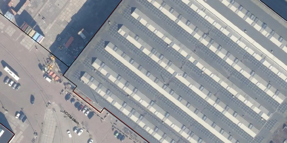 Het perceel waarop NDSM-plein 103 staat heeft een oppervlakte van 2,1 ha. Dit is een zeer groot perceel. De perceeloppervlakte wordt geregistreerd door het Kadaster. Gedetailleerde informatie over de maten van dit perceel kunt u vinden in het rapport Kadastrale kaart met maatvoering van NDSM-plein 103.