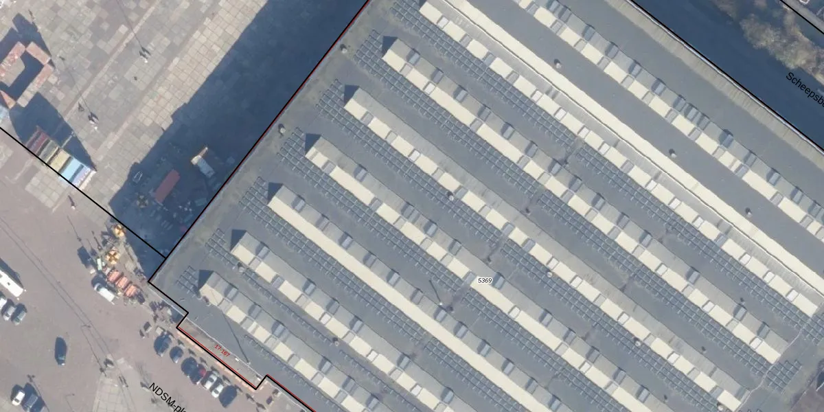 Het perceel waarop NDSM-plein 155 staat heeft een oppervlakte van 2,1 ha. Dit is een zeer groot perceel. De perceeloppervlakte wordt geregistreerd door het Kadaster. Gedetailleerde informatie over de maten van dit perceel kunt u vinden in het rapport Kadastrale kaart met maatvoering van NDSM-plein 155.