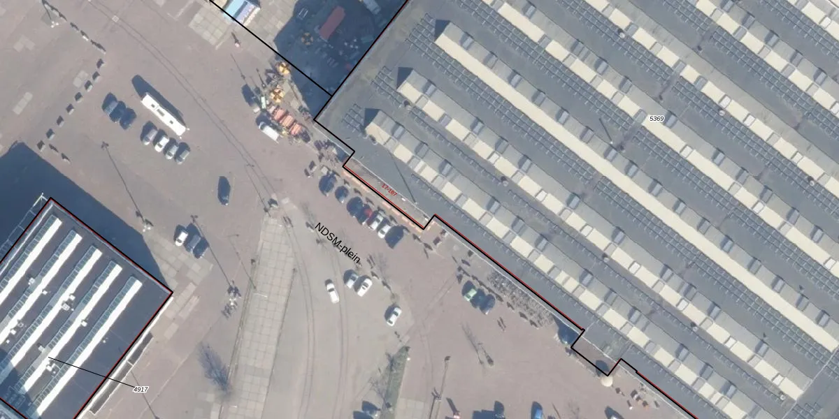 Het perceel waarop NDSM-plein 19 staat heeft een oppervlakte van 2,1 ha. Dit is een zeer groot perceel. De perceeloppervlakte wordt geregistreerd door het Kadaster. Gedetailleerde informatie over de maten van dit perceel kunt u vinden in het rapport Kadastrale kaart met maatvoering van NDSM-plein 19.