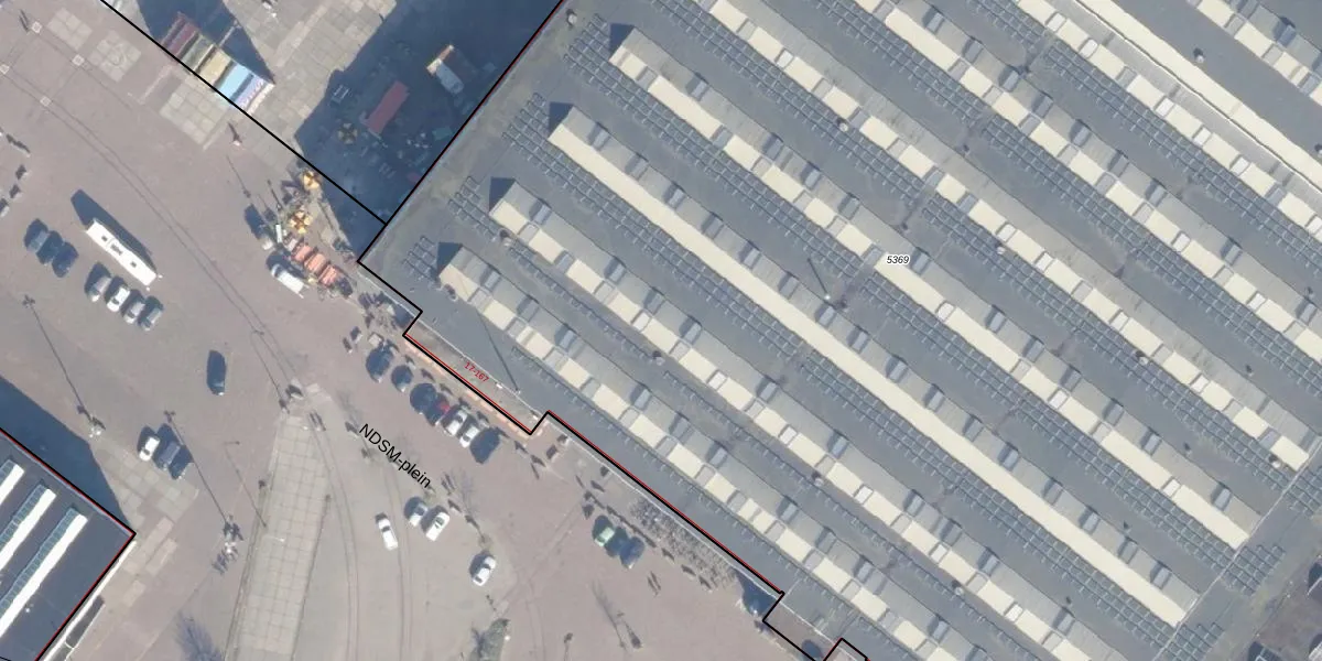 Het perceel waarop NDSM-plein 49 staat heeft een oppervlakte van 2,1 ha. Dit is een zeer groot perceel. De perceeloppervlakte wordt geregistreerd door het Kadaster. Gedetailleerde informatie over de maten van dit perceel kunt u vinden in het rapport Kadastrale kaart met maatvoering van NDSM-plein 49.
