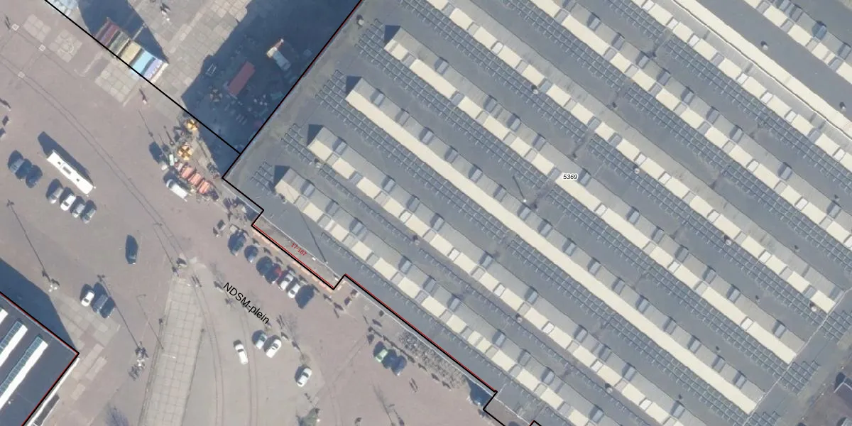 Het perceel waarop NDSM-plein 53 staat heeft een oppervlakte van 2,1 ha. Dit is een zeer groot perceel. De perceeloppervlakte wordt geregistreerd door het Kadaster. Gedetailleerde informatie over de maten van dit perceel kunt u vinden in het rapport Kadastrale kaart met maatvoering van NDSM-plein 53.