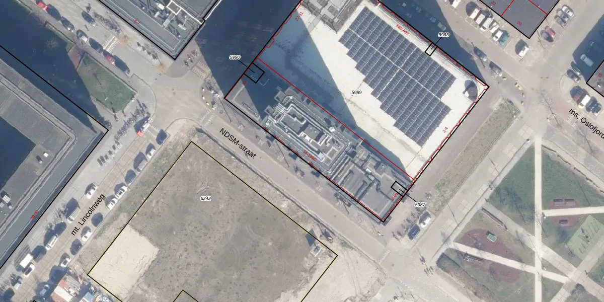 Het perceel waarop NDSM-straat 183 staat heeft een oppervlakte van 3755 m². Dit is een zeer groot perceel. De perceeloppervlakte wordt geregistreerd door het Kadaster. Gedetailleerde informatie over de maten van dit perceel kunt u vinden in het rapport Kadastrale kaart met maatvoering van NDSM-straat 183.