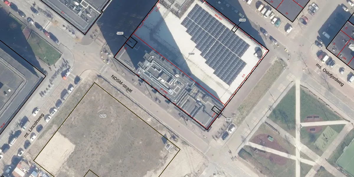 Het perceel waarop NDSM-straat 73 staat heeft een oppervlakte van 3755 m². Dit is een zeer groot perceel. De perceeloppervlakte wordt geregistreerd door het Kadaster. Gedetailleerde informatie over de maten van dit perceel kunt u vinden in het rapport Kadastrale kaart met maatvoering van NDSM-straat 73.