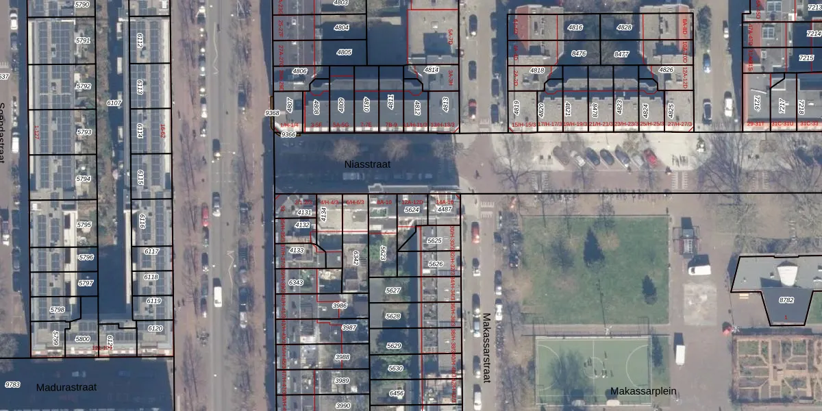 Het perceel waarop Niasstraat 12-D staat heeft een oppervlakte van 74 m². Dit is een klein perceel. De perceeloppervlakte wordt geregistreerd door het Kadaster. Gedetailleerde informatie over de maten van dit perceel kunt u vinden in het rapport Kadastrale kaart met maatvoering van Niasstraat 12-D.