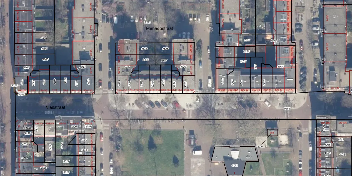Het perceel waarop Niasstraat 25-H staat heeft een oppervlakte van 75 m². Dit is een klein perceel. De perceeloppervlakte wordt geregistreerd door het Kadaster. Gedetailleerde informatie over de maten van dit perceel kunt u vinden in het rapport Kadastrale kaart met maatvoering van Niasstraat 25-H.