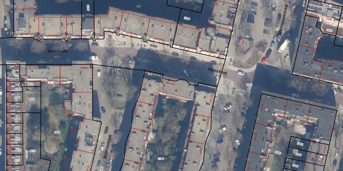 Het perceel waarop Niasstraat 38-B staat heeft een oppervlakte van 4744 m². Dit is een zeer groot perceel. De perceeloppervlakte wordt geregistreerd door het Kadaster. Gedetailleerde informatie over de maten van dit perceel kunt u vinden in het rapport Kadastrale kaart met maatvoering van Niasstraat 38-B.