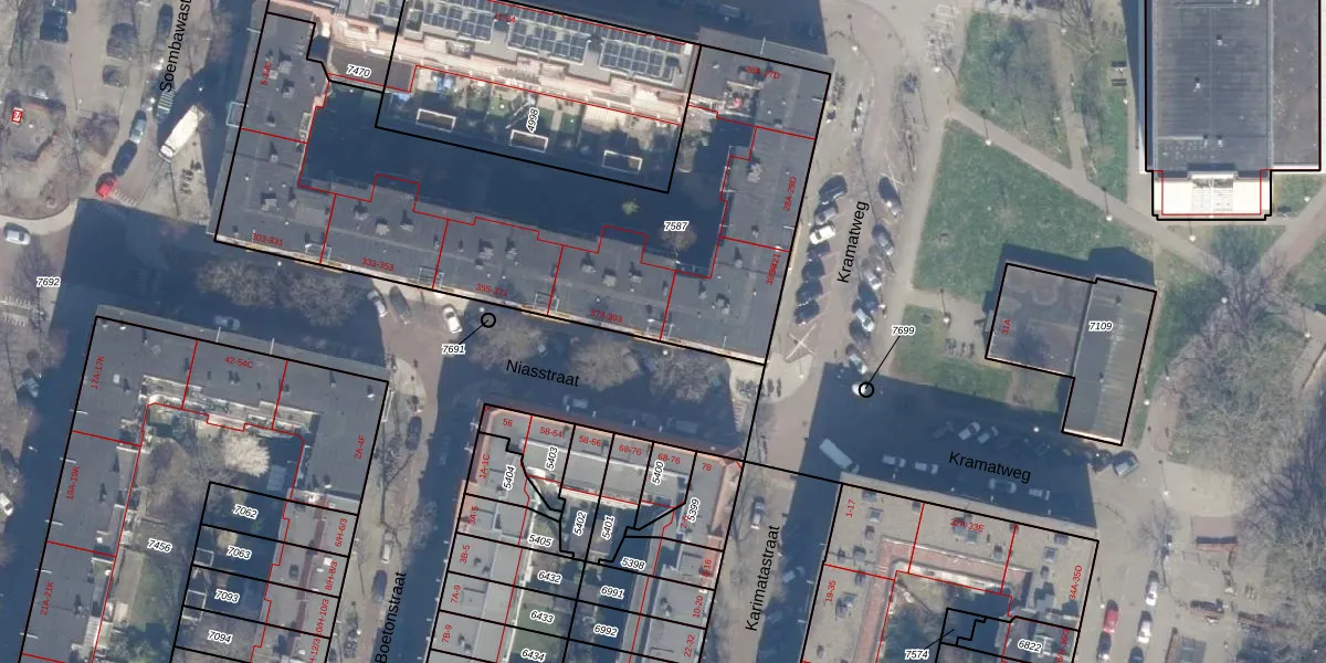Het perceel waarop Niasstraat 403 staat heeft een oppervlakte van 2530 m². Dit is een zeer groot perceel. De perceeloppervlakte wordt geregistreerd door het Kadaster. Gedetailleerde informatie over de maten van dit perceel kunt u vinden in het rapport Kadastrale kaart met maatvoering van Niasstraat 403.
