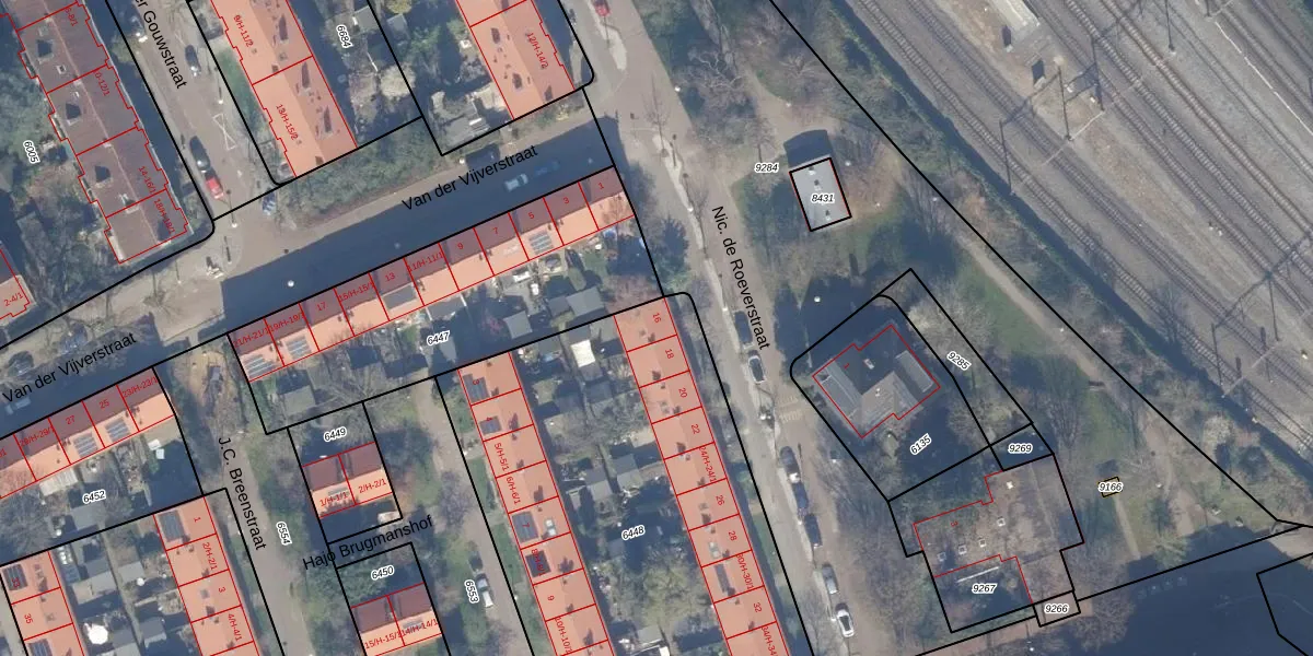 Het perceel waarop Nic. de Roeverstraat 16 staat heeft een oppervlakte van 2590 m². Dit is een zeer groot perceel. De perceeloppervlakte wordt geregistreerd door het Kadaster. Gedetailleerde informatie over de maten van dit perceel kunt u vinden in het rapport Kadastrale kaart met maatvoering van Nic. de Roeverstraat 16.