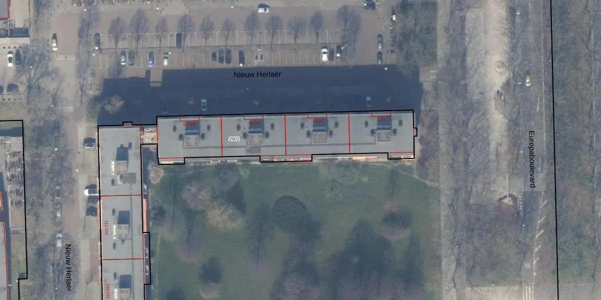 Het perceel waarop Nieuw Herlaer 37 staat heeft een oppervlakte van 2600 m². Dit is een zeer groot perceel. De perceeloppervlakte wordt geregistreerd door het Kadaster. Gedetailleerde informatie over de maten van dit perceel kunt u vinden in het rapport Kadastrale kaart met maatvoering van Nieuw Herlaer 37.