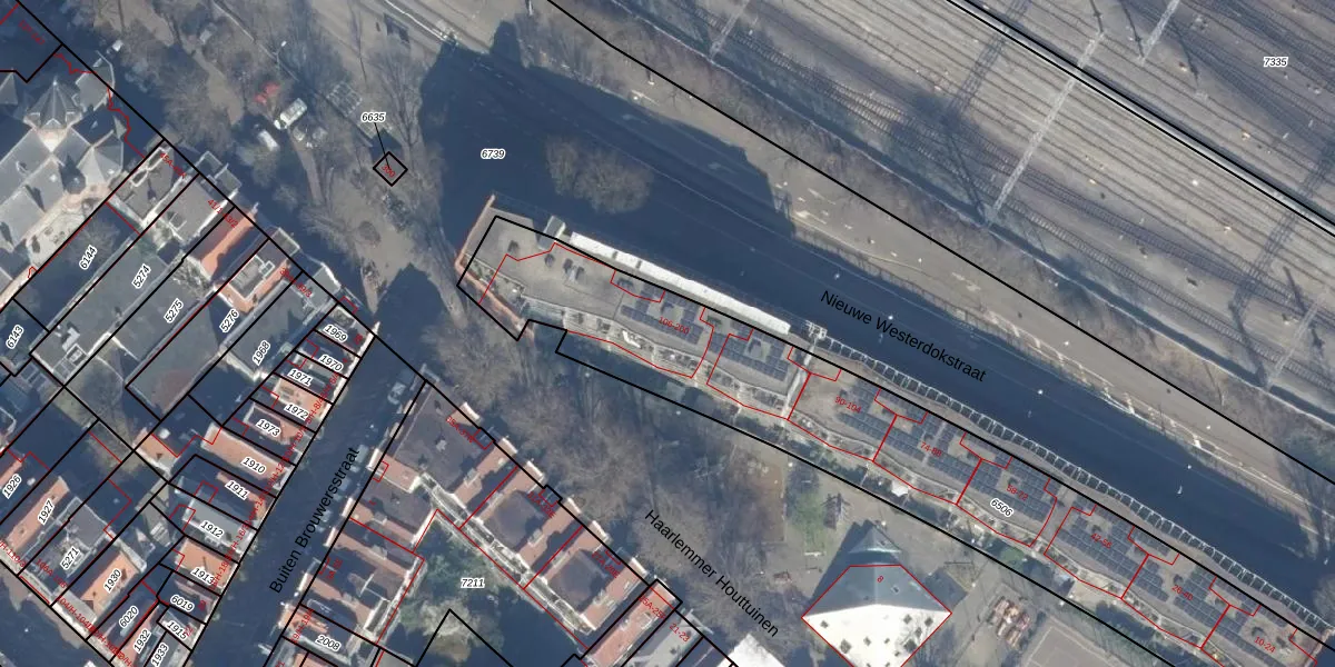 Het perceel waarop Nieuwe Westerdokstraat 186 staat heeft een oppervlakte van 2168 m². Dit is een zeer groot perceel. De perceeloppervlakte wordt geregistreerd door het Kadaster. Gedetailleerde informatie over de maten van dit perceel kunt u vinden in het rapport Kadastrale kaart met maatvoering van Nieuwe Westerdokstraat 186.