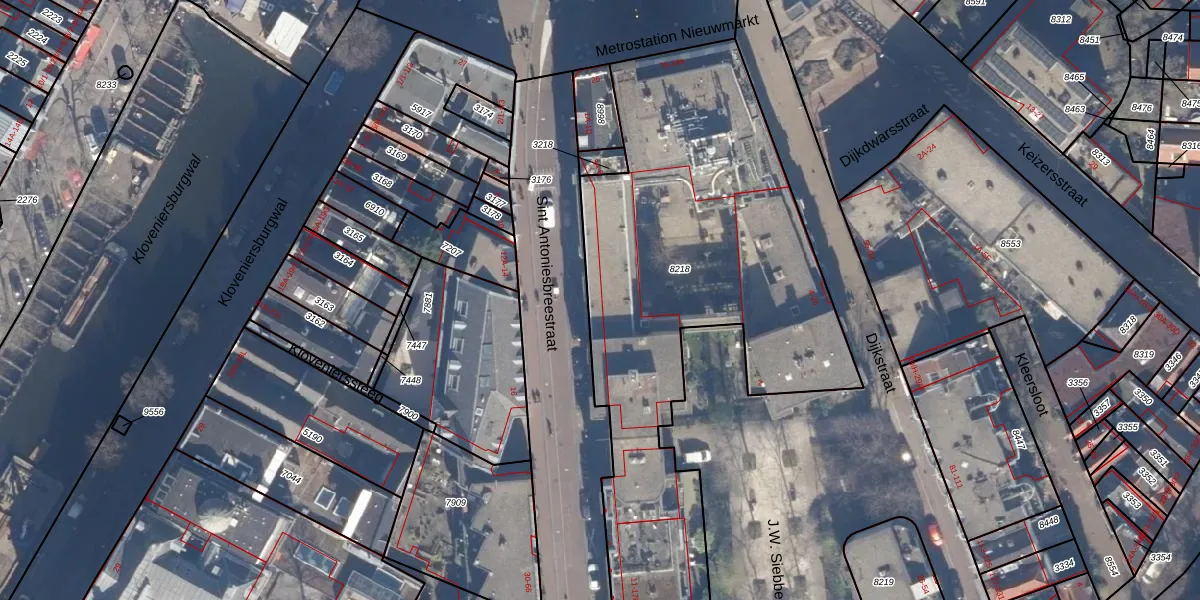 Het perceel waarop Nieuwmarkt 95 staat heeft een oppervlakte van 3820 m². Dit is een zeer groot perceel. De perceeloppervlakte wordt geregistreerd door het Kadaster. Gedetailleerde informatie over de maten van dit perceel kunt u vinden in het rapport Kadastrale kaart met maatvoering van Nieuwmarkt 95.