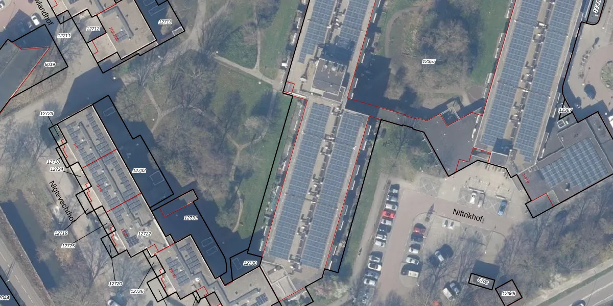 Het perceel waarop Niftrikhof 357 staat heeft een oppervlakte van 9513 m². Dit is een zeer groot perceel. De perceeloppervlakte wordt geregistreerd door het Kadaster. Gedetailleerde informatie over de maten van dit perceel kunt u vinden in het rapport Kadastrale kaart met maatvoering van Niftrikhof 357.