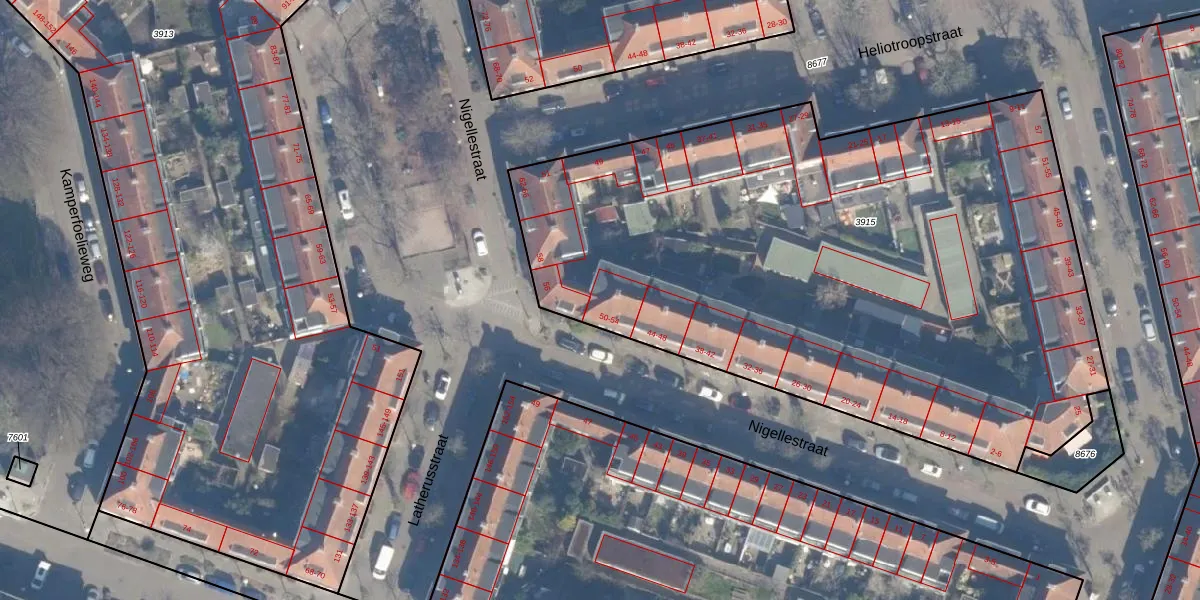 Het perceel waarop Nigellestraat 54 staat heeft een oppervlakte van 4158 m². Dit is een zeer groot perceel. De perceeloppervlakte wordt geregistreerd door het Kadaster. Gedetailleerde informatie over de maten van dit perceel kunt u vinden in het rapport Kadastrale kaart met maatvoering van Nigellestraat 54.