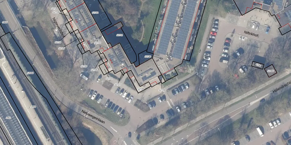 Het perceel waarop Nigtevechthof 41 staat heeft een oppervlakte van 1280 m². Dit is een zeer groot perceel. De perceeloppervlakte wordt geregistreerd door het Kadaster. Gedetailleerde informatie over de maten van dit perceel kunt u vinden in het rapport Kadastrale kaart met maatvoering van Nigtevechthof 41.