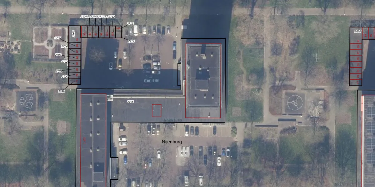 Het perceel waarop Nijenburg 10 staat heeft een oppervlakte van 2815 m². Dit is een zeer groot perceel. De perceeloppervlakte wordt geregistreerd door het Kadaster. Gedetailleerde informatie over de maten van dit perceel kunt u vinden in het rapport Kadastrale kaart met maatvoering van Nijenburg 10.