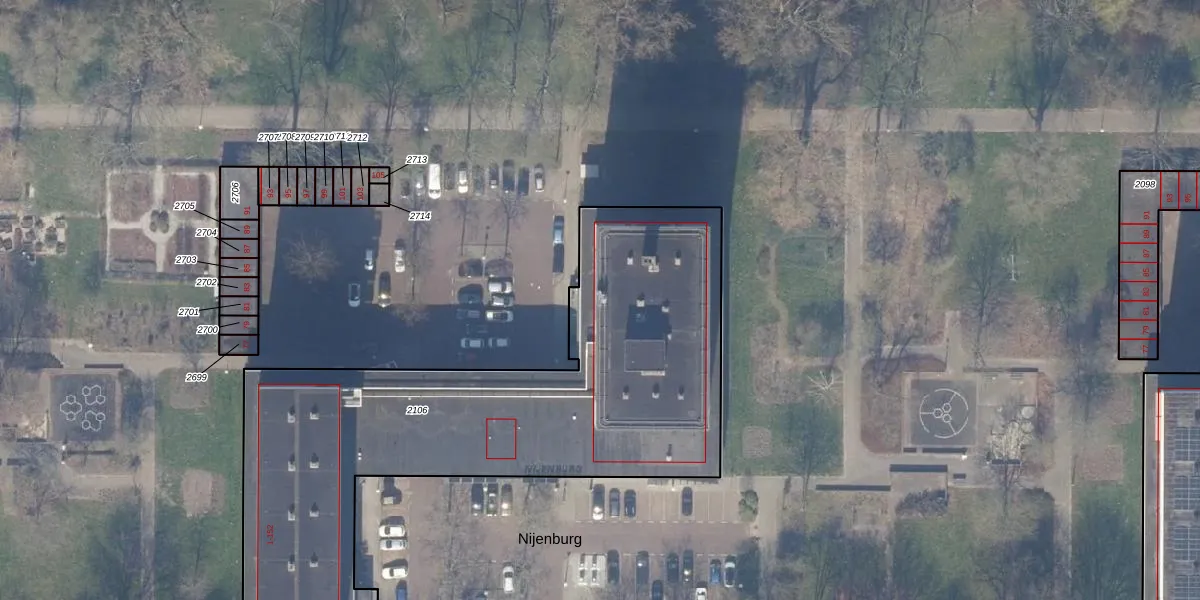 Het perceel waarop Nijenburg 112 staat heeft een oppervlakte van 2815 m². Dit is een zeer groot perceel. De perceeloppervlakte wordt geregistreerd door het Kadaster. Gedetailleerde informatie over de maten van dit perceel kunt u vinden in het rapport Kadastrale kaart met maatvoering van Nijenburg 112.