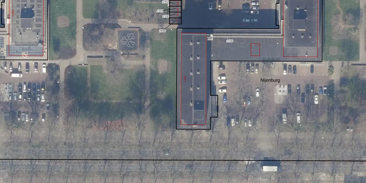 Het perceel waarop Nijenburg 17 staat heeft een oppervlakte van 2815 m². Dit is een zeer groot perceel. De perceeloppervlakte wordt geregistreerd door het Kadaster. Gedetailleerde informatie over de maten van dit perceel kunt u vinden in het rapport Kadastrale kaart met maatvoering van Nijenburg 17.