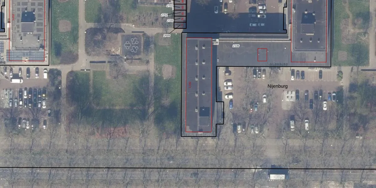 Het perceel waarop Nijenburg 21 staat heeft een oppervlakte van 2815 m². Dit is een zeer groot perceel. De perceeloppervlakte wordt geregistreerd door het Kadaster. Gedetailleerde informatie over de maten van dit perceel kunt u vinden in het rapport Kadastrale kaart met maatvoering van Nijenburg 21.